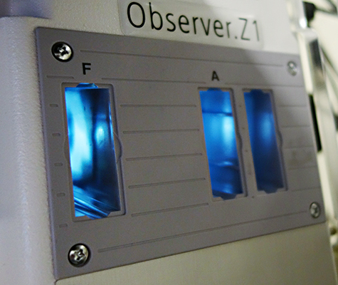 At the right rear of the microscope body there are three slots for filters/apertures.