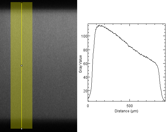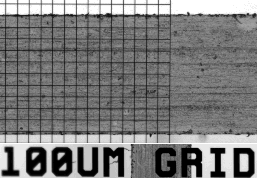 Side of glass slide imaged by reflectance with 10X N.A. 0.3 Plan-Neofluar objective. Spatial scale from metadata read into ImageJ using Loci plugins.