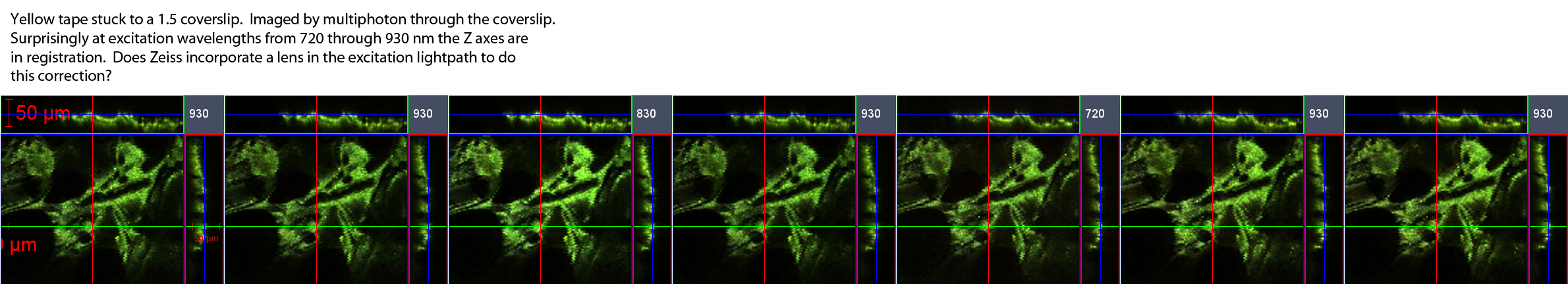 A question was raised whether different wavelengths of light frm 720 to 1040 nm are focused at different depths in the sample. This is important for colocalization and for photo manipulation. For instance, if a tissue is zapped at 720 nm to photo-activate and then zapped at 930 nm for imaging, are the same volumes being illuminated,