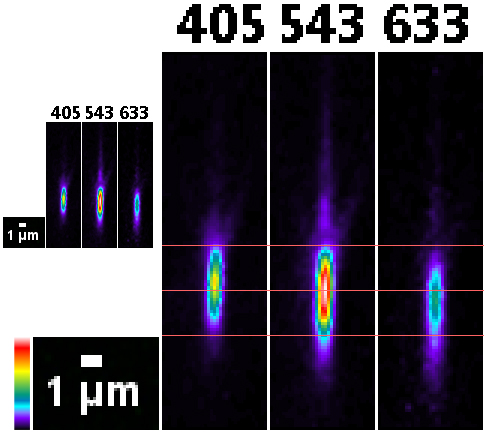 Conclusion: for standard confocal there is no correction for chromatic aberration necessary in the Z axis. For more precise work, the user may want to shift the infra-red image up 0.26 to 0.5 um relative to the green and red images.