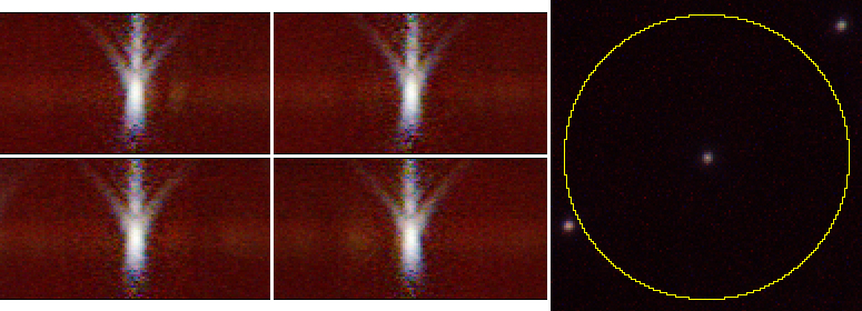 The alignment is not completely corrected. The 488-543-633 stack shown above, contrast equalized, radially resliced, and shown with 45 degree average projected wedges shows slight tilt, but it is not noticeable without the contrast EQ.