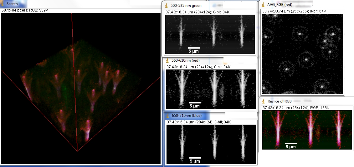 Another more important alignment issue is in XY and is common with the confocal microscopes that use a separate light path for the 405 laser. Shown at 200% original scale, the 420-460 nm image is a pixel or two off all the other images in the XY axis (the Z step is 0.34 um). Red is the 420-460 nm channel and green/blue are the other channels.