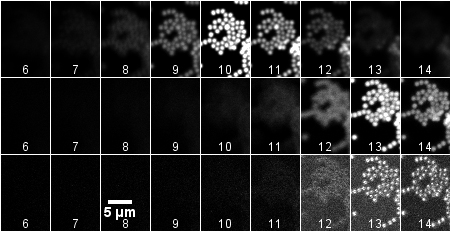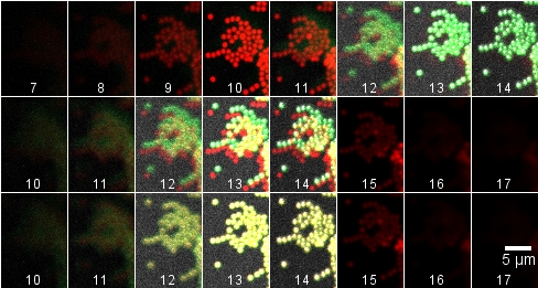 Middle row: 3 um inserted at beginning of red (840 nm) stack and 3 um at the end of the green stacks. (The last three frames have no green in them because the original Z stack did not step far enough. It is important to make the Z series extend beyond the sample.)