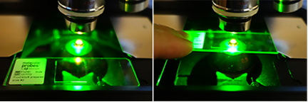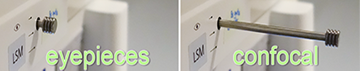 To look by eye, the slider on the right side of the microscope must be pushed in, all the way to the left.