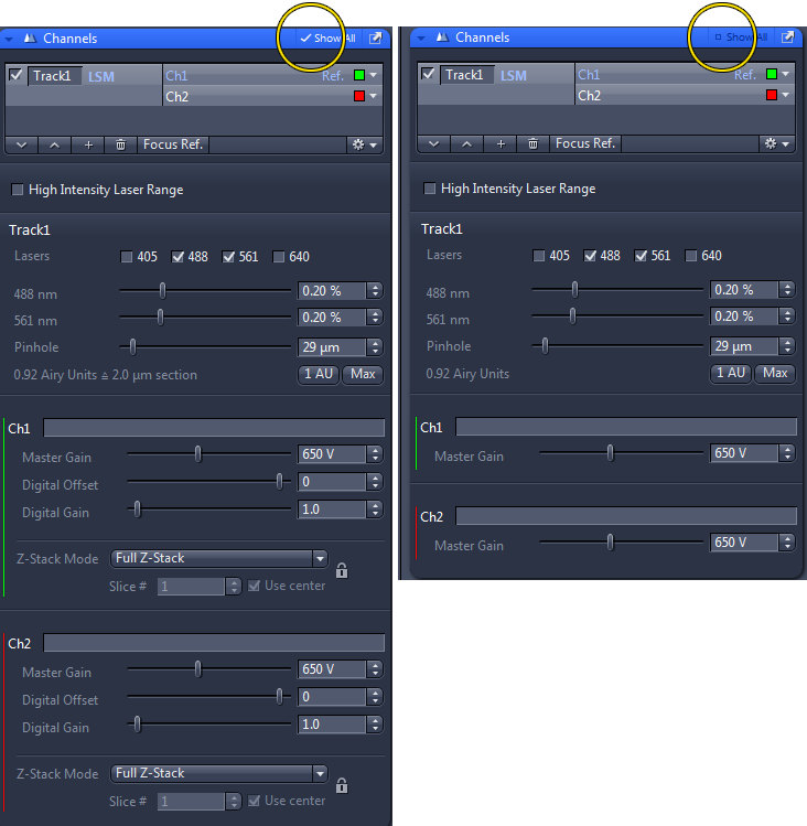 In the images below, note that you can click off the Show All box at the top of the Channels window so that the sliders for Digital Gain and Offset will disappear so you won't be tempted to touch them.