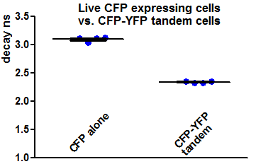 To test the PicoQuant system on the Zeiss 880 confocal in June 2016 a postdoc prepared cells expressing CFP alone and cells expressing CFP-YFP separated by 6 bases thinking this would result in FRET.