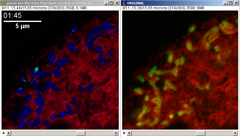 This one shows the method works, but the reason the mitochondrion isn't overlapping with ER is because the mitochondria jumped faster than the two channel imaging. Or maybe it is real that the mitochondrion escaped the ER for up to 15 seconds. Who knows?
