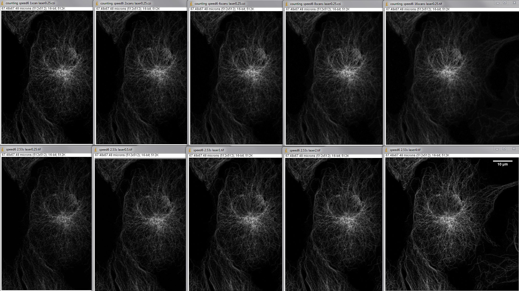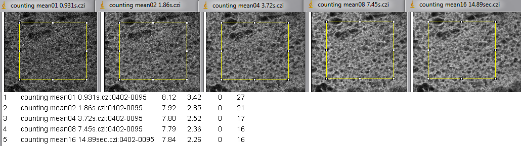 Top row is photon counting with averaging set. The contrast for all images in the top row is the same. Each full field took 2.53 seconds per scan to image. The title bar says how many scans were averaged to collect the image.
