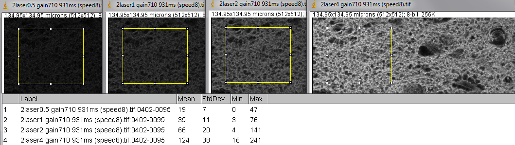 The bottom row is contrast stretched linearly min to max. Each image is a single scane at 2.53 second. The laser settings varied from 0.25 to 4 on the slider in the Zen software. Laser power measurments done a few days earlier showed that each halving/doubling of the number correlates directly with laser power.