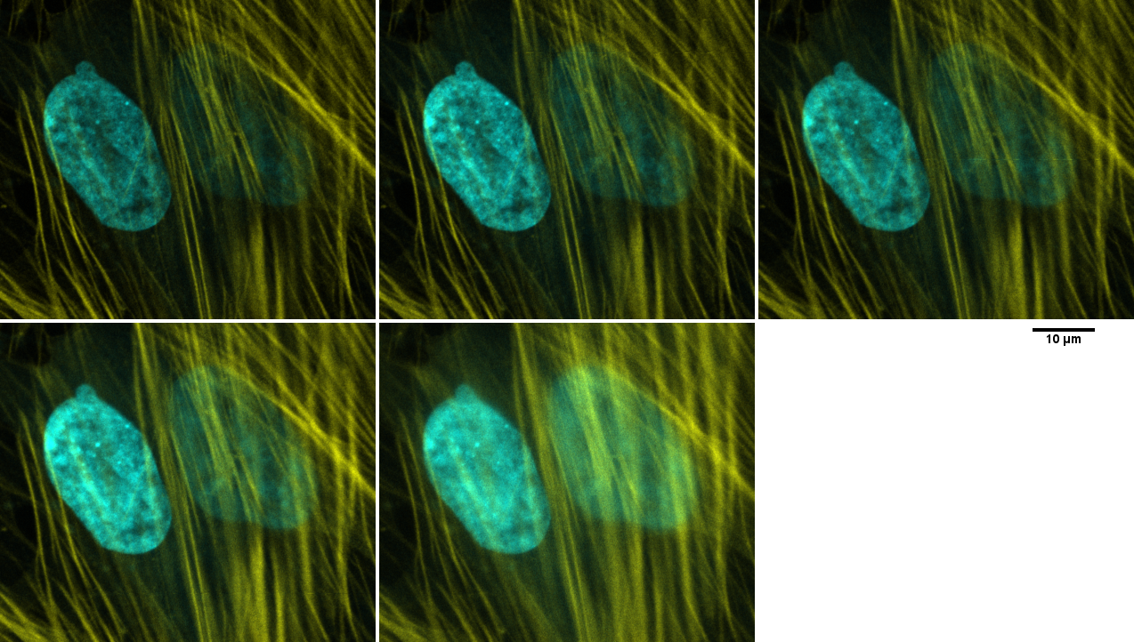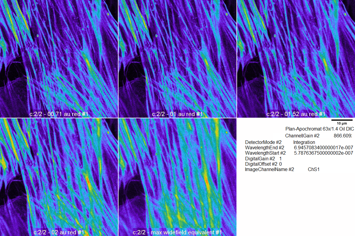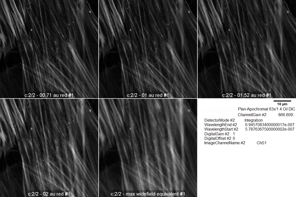 Images were taken with pinhole, as calculated by Zeiss Zen Black software, at 0.71, 1.0, 1.52, 2.0, and maximum opened. Laser was attenuated between pinhole settings. Gain, scan speed, averaging kept constant for all pictures. Original images 1024 x 1024 pixels oversampled at each pixel 0.07 um. Other metadata here.