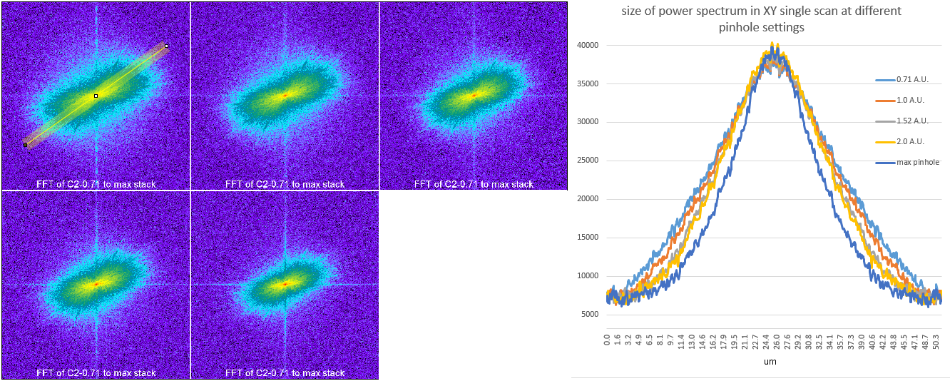 For each pinhole setting, the ImageJ FFT command was executed on the whole original image. The larger the power spectrum, the more high frequency (i.e. resolution).
