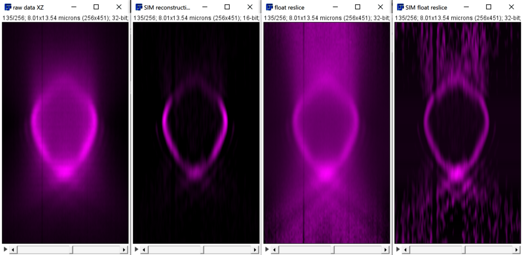 This was collected with Lattice SIM so each Z slice shown as raw data bead is actually median projection image of 13 phases. (Remapped hyperstack from xyczt to xyctz and then median projected.)