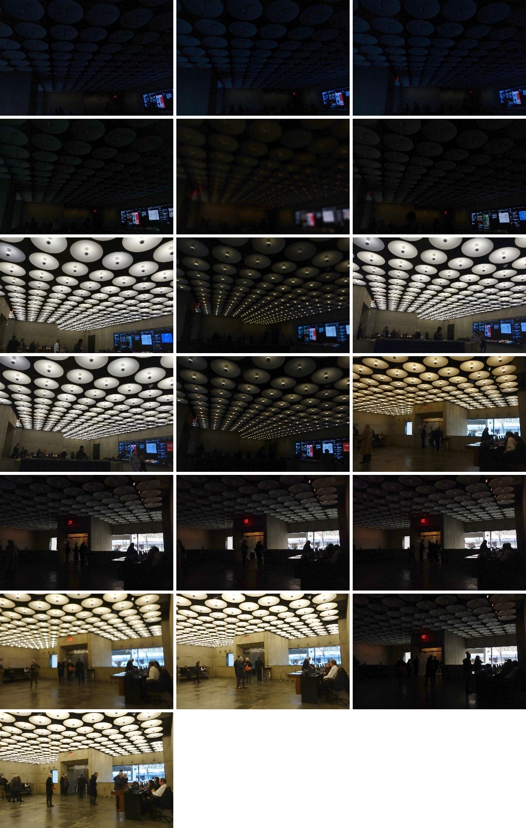 The MET Breuer installed LEDs with a power supply that does not keep the DC power to the bulbs stable. Therefore, the LEDs blink at a high rate, 60 Hz. For people who can detect this, it is strobe lighting on steroids. When anything in my field of view moves, instead of a smooth movement, it is broken up into discrete steps; think of strobe lighting at a dance club, only much faster. When you are in the lobby, the entire room, from ticket counter to cloak room to elevators is a rapidly blinking chamber, every movement broken into discrete snapshots. Far more effective for drawing attention to the nature of light, surroundings, environment, ambience, than any California artist championed by Calvin Tomkins.