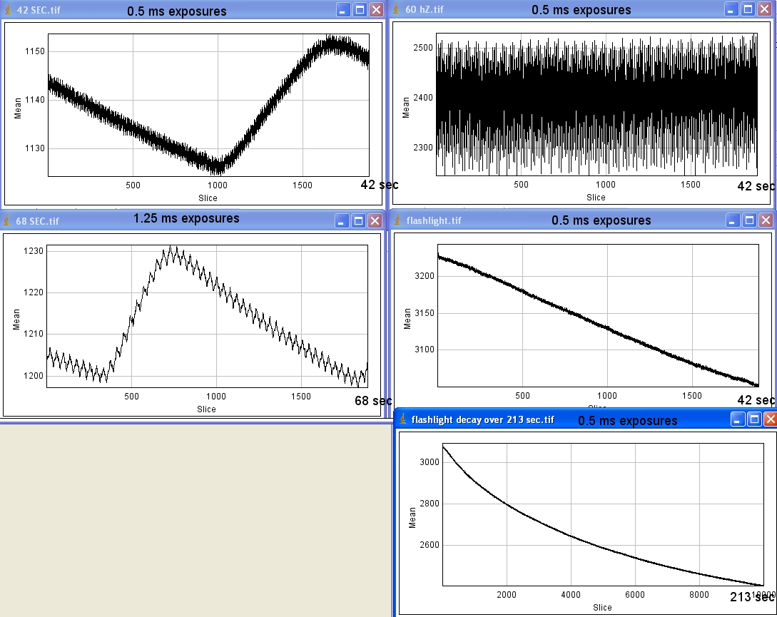The second was with a new "stable" high intensity LED we were sent on spec to try on a spinning disk confocal. With the standard lasers, the shortest exposure we could use with the confocal was 22 ms without seeing the microlens patterns (took 22 ms for the spinning disk to cover the entire field). But coupled with the LED, we got patterning. The intensity fluctuation was a hair over 1% in a sawtooth pattern. However, I was concerned it could be the camera, so as a controls I imaged a desk lamp with a fluorescent bulb (60 Hz, curve not shown) and a battery operated flashlight which decayed steadily because the battery was dying, the the point is that the curve is smooth.