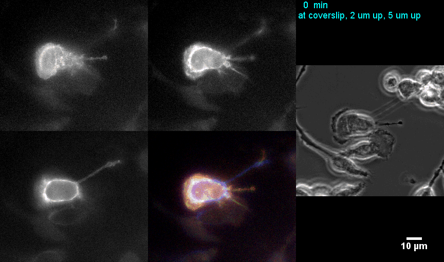 Fluorescent timelapse Z series and phase contrast image. One small area of one field shown. Experiment was able to image 9 large fields with Z series per minute at high spatial resolution. Experiments may be run overnight. |