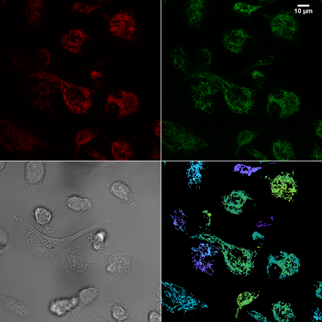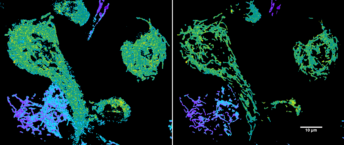The following image shown at orginal 1:1 spatail scale illustrates the ratio before and after masking was applied to delineate the mitochondria structure.