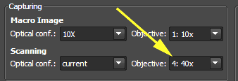 Before clicking scan, it is important to make sure the currect objective lens is chosen. "3: 40x" is the LWD objective. "4: 40x" is the correct one; make sure you choose this if using the 40x.