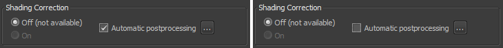 Shading Correction. This if for when the lighting is uneven, such as dark corners. I'm not sure why the Off button is clicked in both these cases because in the case on the left, where the Automatic postprocessing box is clicked, by first clicking on the ellipses ("...") there were options to fix shading problems and after image acquisition they were applied. We have found images look better with shading correction off.