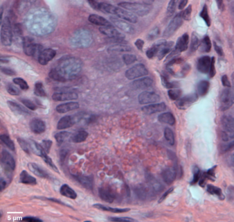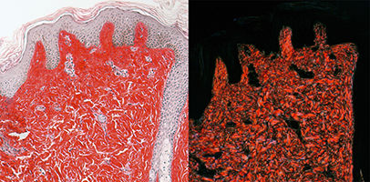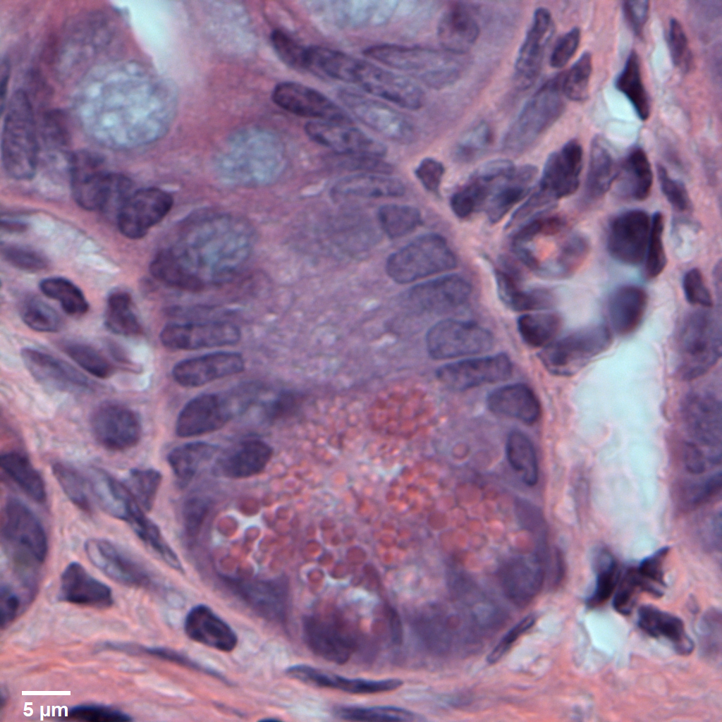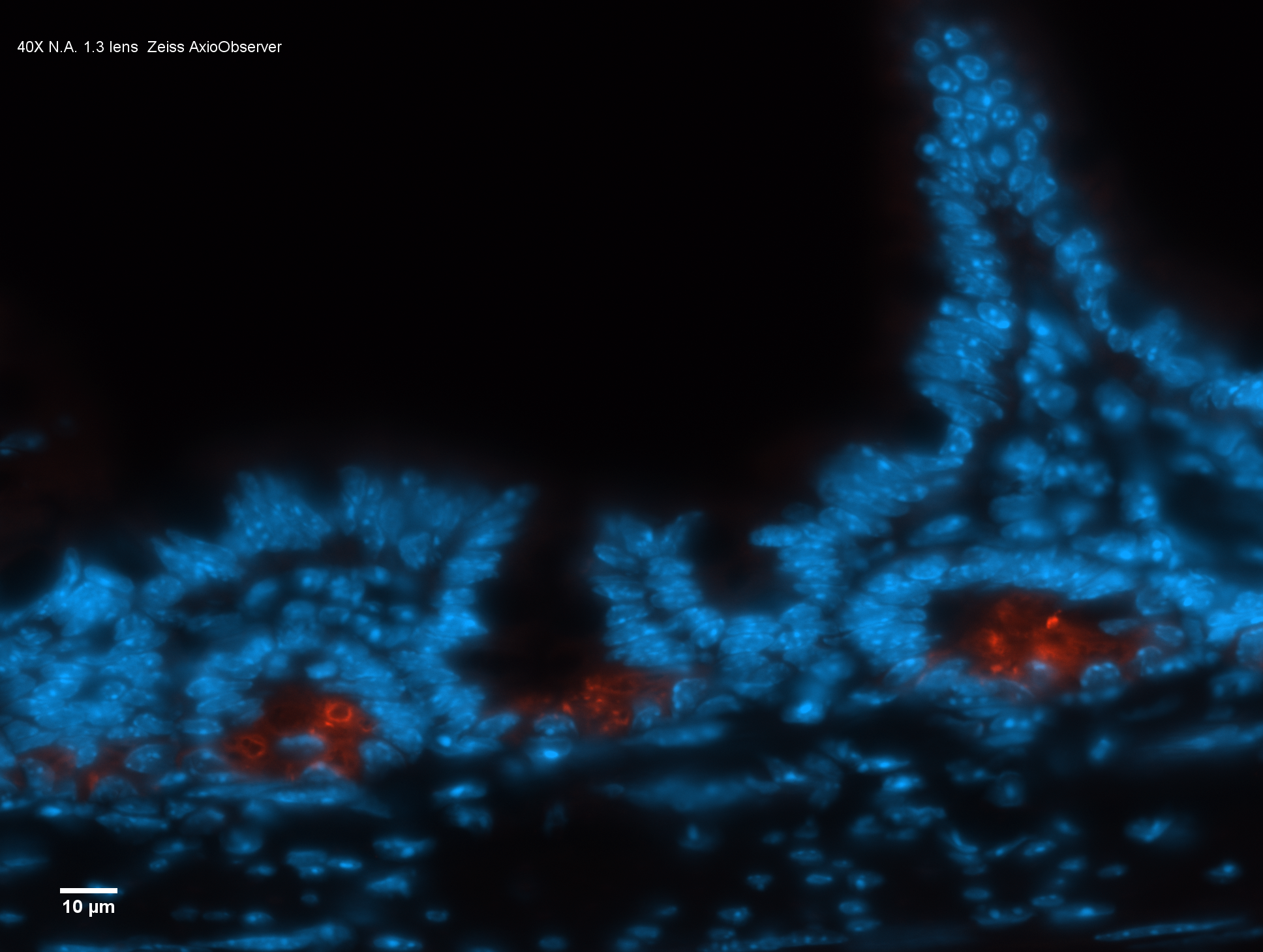 Example Images. Click on images for larger versions. All the micrographs in this figure were taken with the AxioObserver: https://www.ncbi.nlm.nih.gov/pmc/articles/PMC9720609/figure/F3/ Example fluorescence imaged with 40X NA 1.3 lens. For full resolution, click on image. Example H&E at highest magnification. Micrographs often not crisp because tissue sections are thicker than the depth of field of the lens. Example of crossed polarization showing collagen,click on image for web page with explanation.
