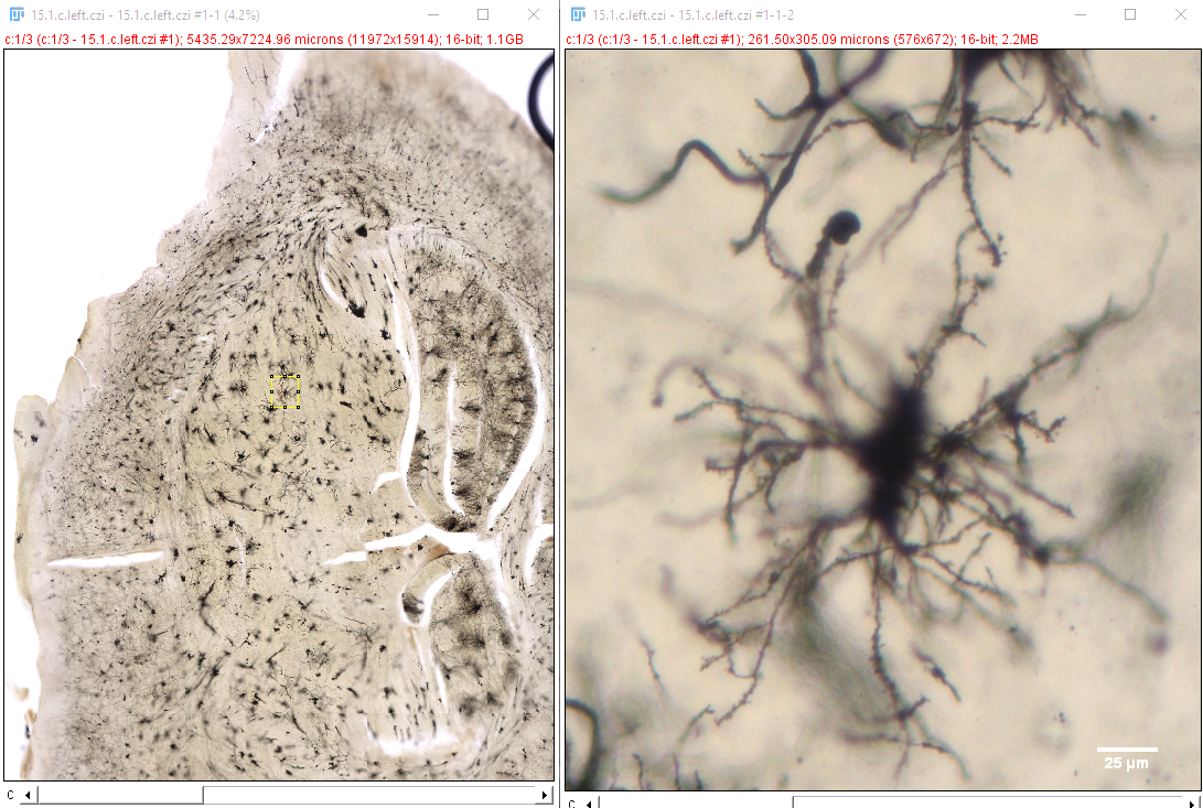 The image at the left shows many tiles of a slice of brain. (These could be montaged with the borders less evident.)