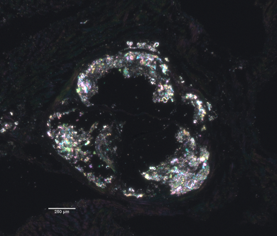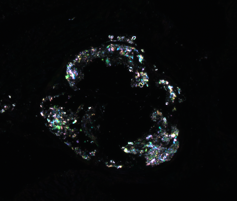 Aorta with cholesterol crystals. Top, full field shown at 25% spatial scale. Bottom, full resolution cropped region.