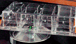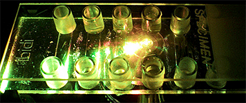 Most microscope stages hold the sample in placed with thin metal under the long ends of the sample. For instance, wells that extend all the way to the ends may not be accessible to the lens. Also, tabs on chambers may need to be cut off to allow the chambe to sit in the recessed stage. The Nunc / LabTek II chambers have both these problems. In the 8 well system pictured, only the middle 4 wells may be used and the bottom tab needs to be clipped or shaved off.