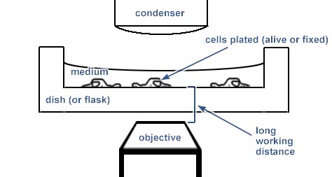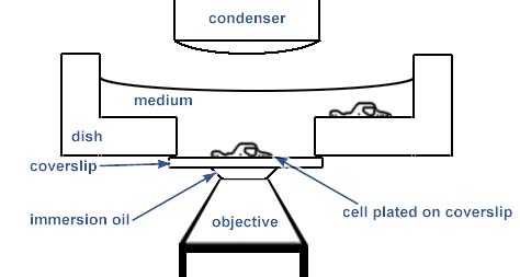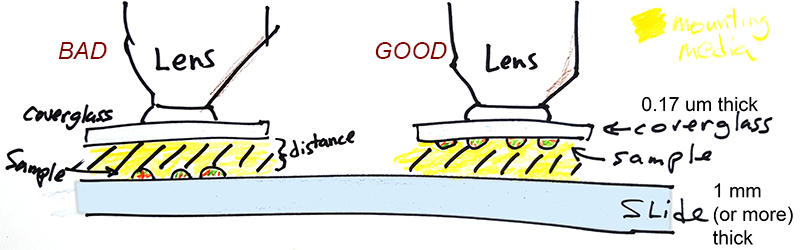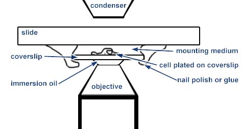 Higher resolution imaging must be performed through a number 1.5 coverslip. For optimal imaging, the cells or tissue should be very flat and sandwiched between a standard glass slide and the coverslip as illustrated. For oil immersion objectives, the coverslip must be fixed in place either by a mounting medium that polymerizes or by nail polish or glue around the edges.
