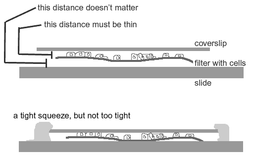 The filter needs to be squished enough to lie flat and to present the cells near the coverslip but not be squished so much that the cells are too flat.