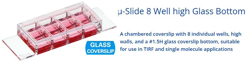 Nunc® Lab-Tek® II chambered coverglass, 8 wells, polystyrene chambers, 1.5 borosilicate coverglass, 0.7 cm2/well N.b. The wells at the end may not be fully accessible to the microscope lens, so keep them empty.. https://assets.thermofisher.com/TFS-Assets/LCD/Specification-Sheets/Nunc-Glass-Bottom-Dish-spec-sheet.pdf https://www.thermofisher.com/order/catalog/product/150680