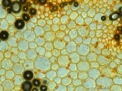 When microscope calibrated correctly (as of today 8 Mar 2017), you can focus at 4X (image at left) and then click on the 40X lens and be in the same location needing only a tweak of the focus (image at right).