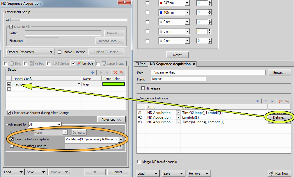Add these time lapses to the "ND Sequence Acquisition" tab. The "ND Sequence Acquisition" interface allows different imaging conditions to be run in sequence. We are running three conditions: 1.) before images, 2.) bleaching, and 3.) after images.