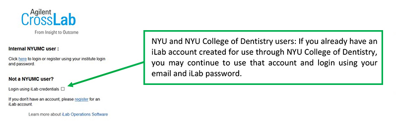 NYU and NYU College of Dentistry users who already have an iLab account created for use through the NYU College of Dentistry may continue to use that account and will log in using their email and iLab password.