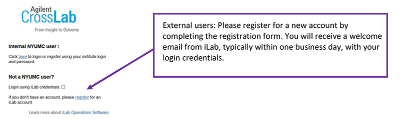 External users should register for a new account by completing the registration form on the iLab login page. You will receive a welcome email from iLab, typically within one business day, with your login credentials.