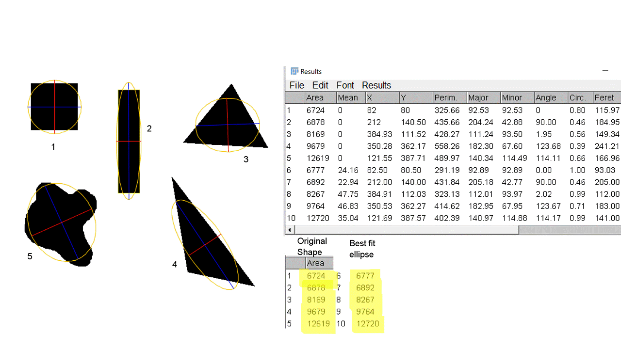 Using ImageJ, are objects and their best fitting ellipse the same area?