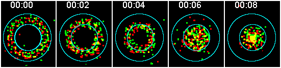 This series of images simulates a red and a green particle collected at precisely the same time. Two examples of simultaneous imaging are confocal where two detectors collect the colors at the same time and a beamsplitter that projects the two different colors onto different sides of the same camera that takes frame snaps that are not progressive.