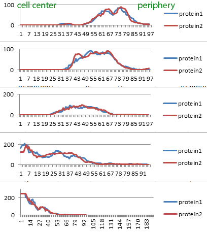 Here one region is a band at the outside of the cell and the other region is the central portion of the cell. It is clear that both proteins translocate from the annulus to the center at the same rate. They migrate together regardless whether they interact. (Yes, the intensities are normalized.)