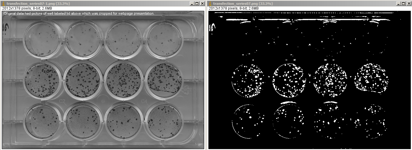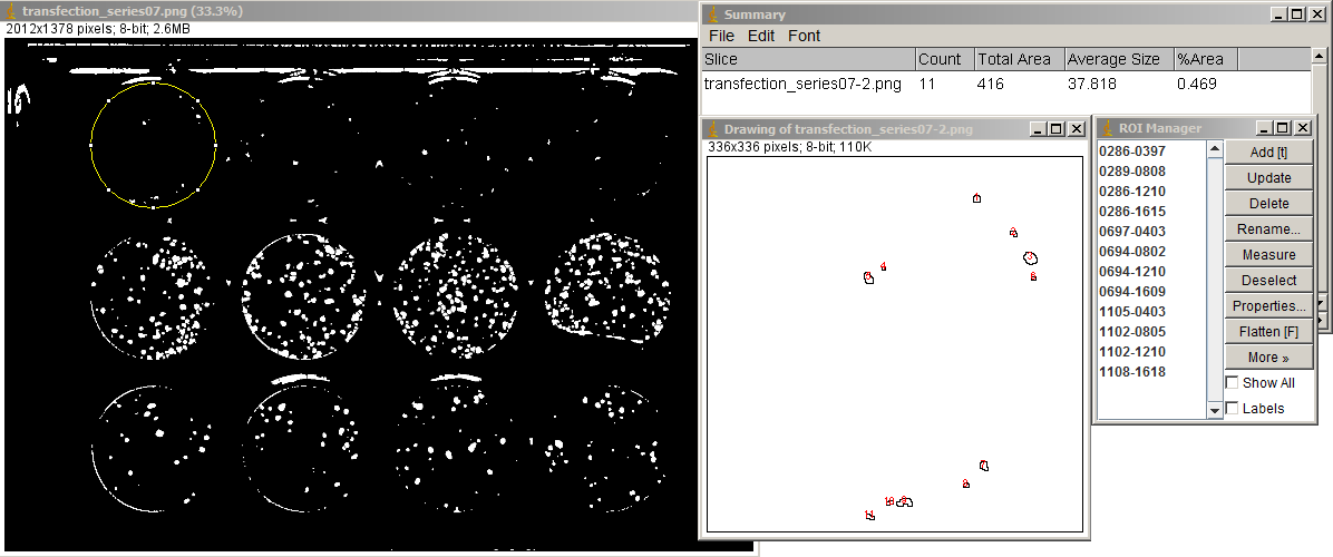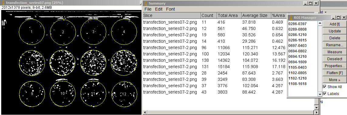 Details: If you try the macro on the data presented here and it doesn't work, it's because 1.) the autothresholding requires the original 16 bits and the top half of the image that was cropped off here for web presentation. When you develop a method for a particular set of pictures, you need to test it with your own thresholding method.