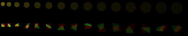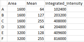 Load the green image above into ImageJ. You may be able to drag and drop it directly from this web page. Convert to 8 bits and measure each spot. The integrated intensity should remain approximately constant.