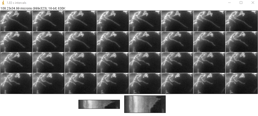 Montage of timepoints with kymogram at bottom. at left, each Y pixel = 1.83 seconds. Scaled to 0.915 sec at right so easier to see.