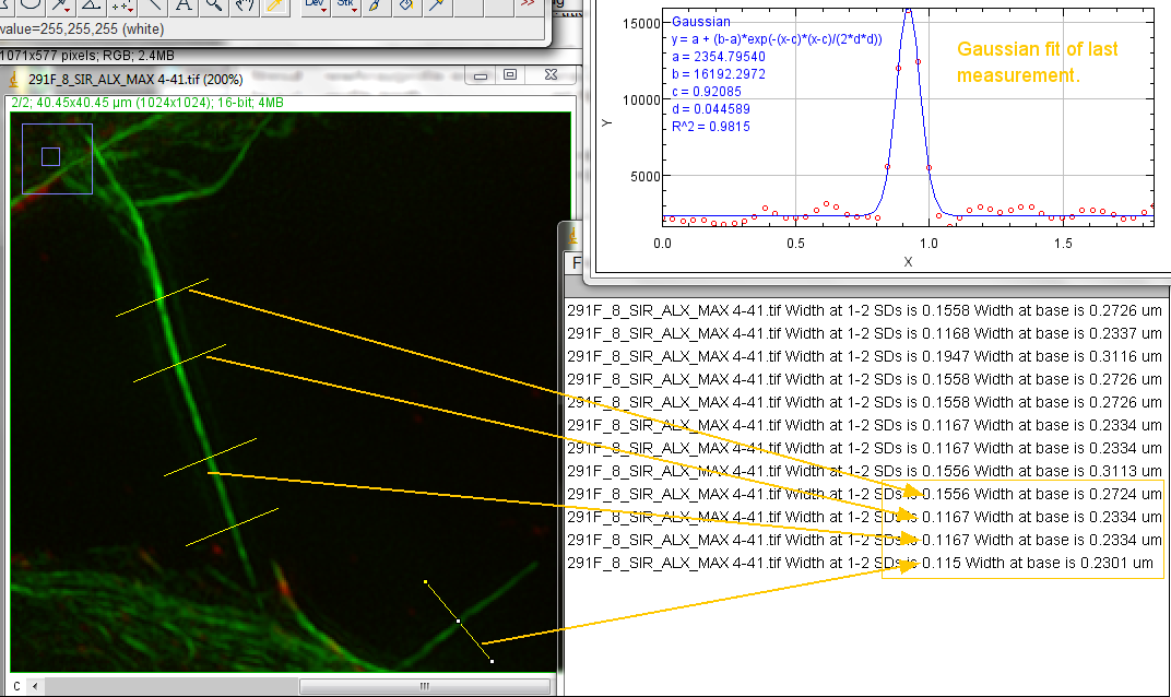 The next version will measure the width of a structure in one channel and then the overlapping structure in another channel so they may be compared, kind of like a G ratio.