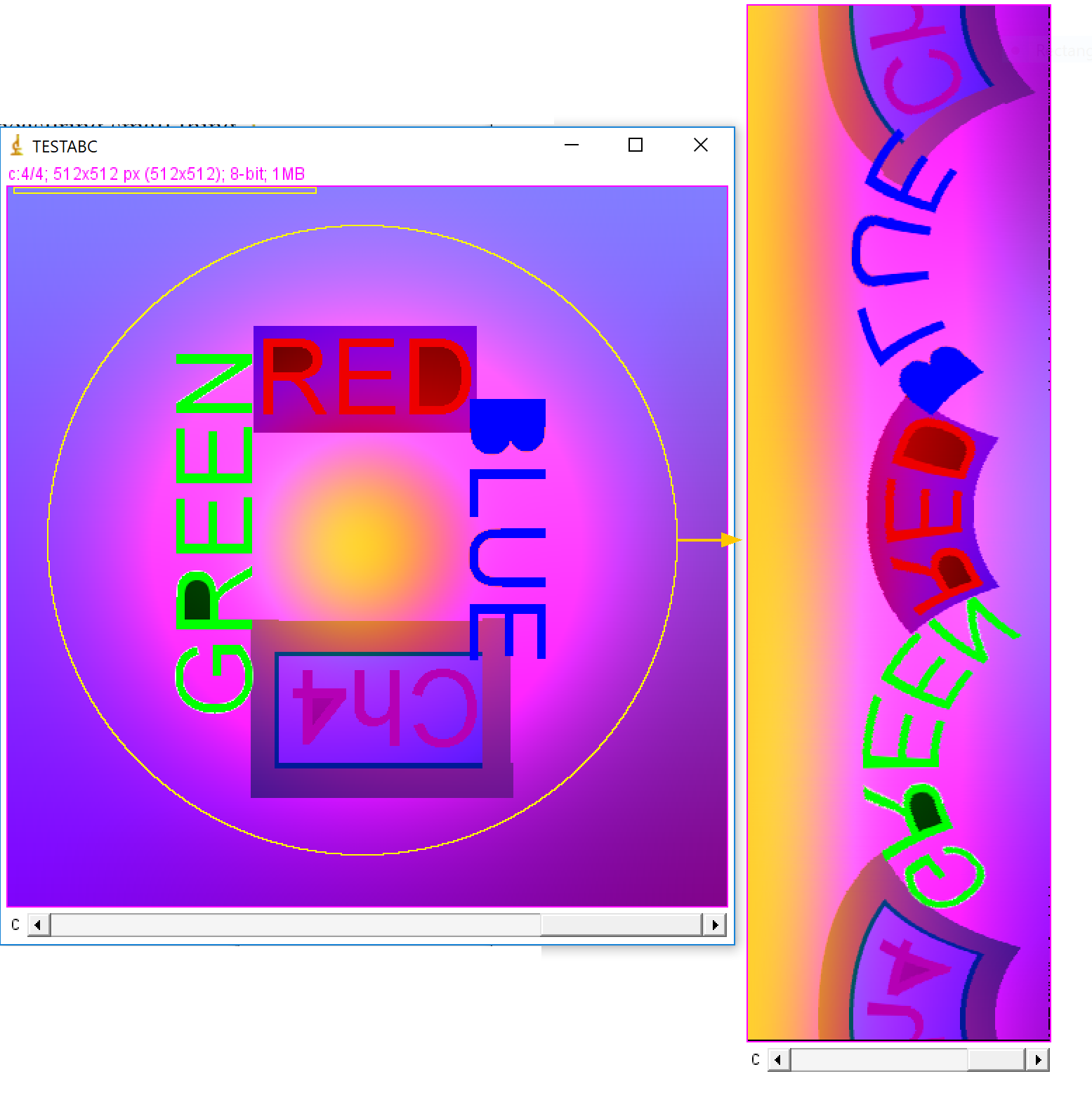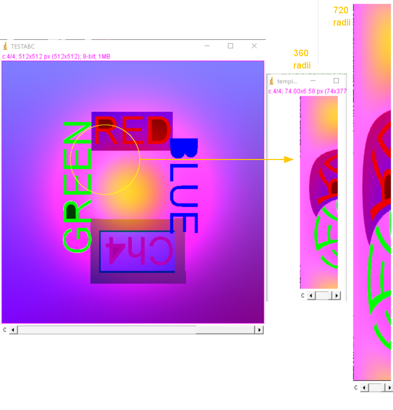 Radial reslice macros for single plane color composite images. Grayscale version as diameter reslice here.