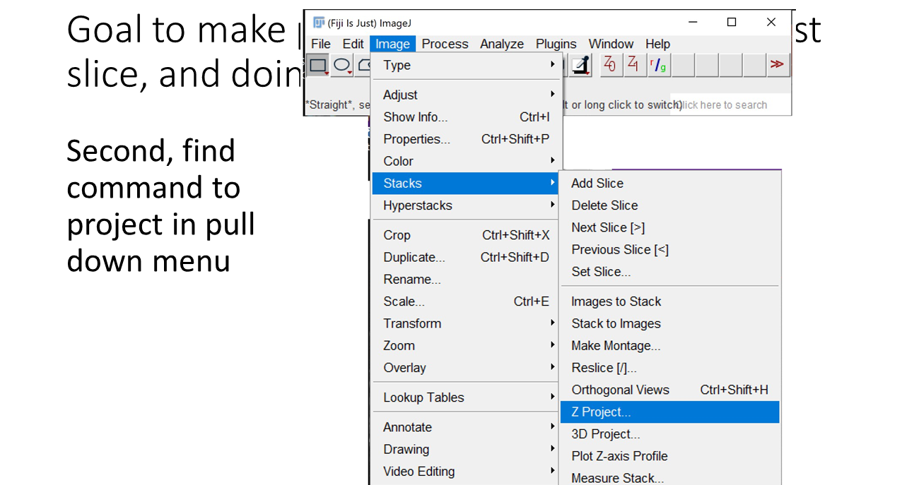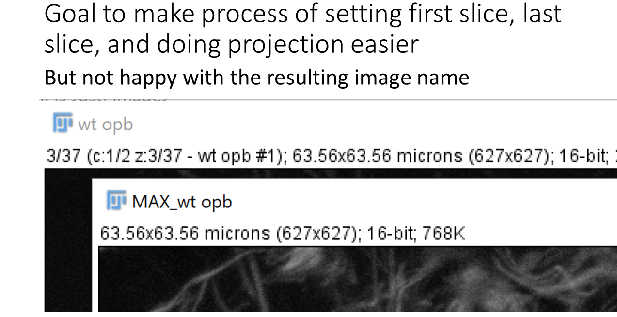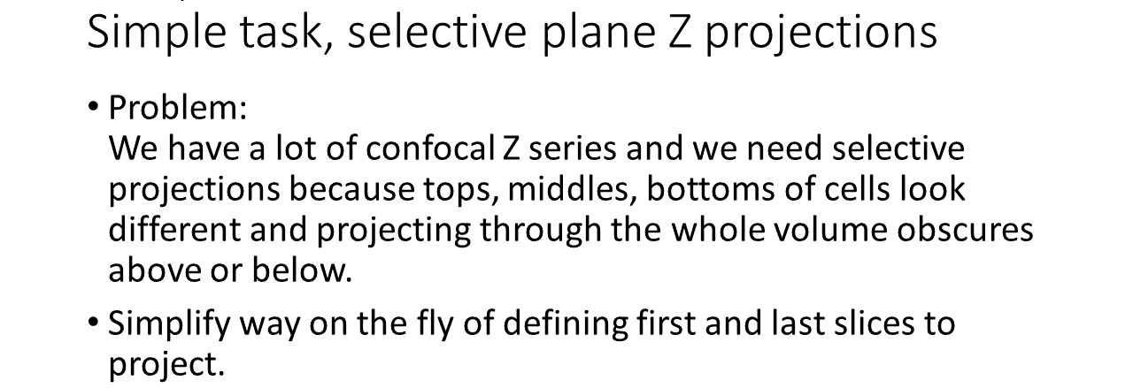 The following slides are from the talk explaining the different methods. The first slides show how the Z projections are done manually. This can get tedious. Methods are shown to make this easier using macros with pull down menu, F keys, right click pull down menu, and (my favorite) an all click in mapped regions method.