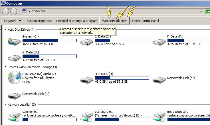 For PCs on the domain, user logs off and back on with their standard Kerberos and password. It will appear as the R: drive unless the user already has a share assigned to R:, in which case it may be mapped by pasting