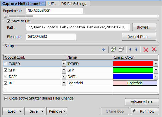 The best way to collect images it to set the illumination intensity and camera exposure time for each channel. Set the filename. Click on the channels in the Capture Multichannel window. Click Run Now. The images will be collected and the file saved. Each time you click Run Now, the file number will be incremented.