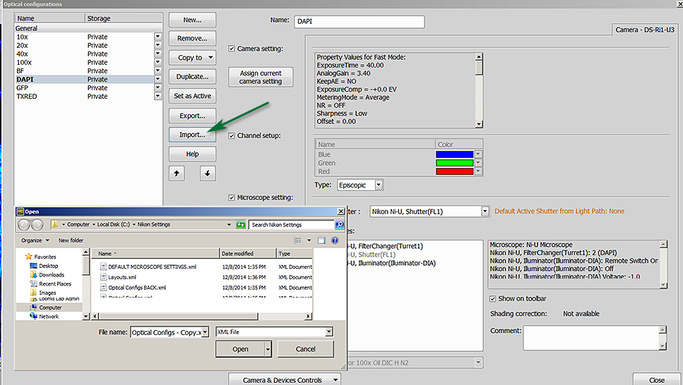 Users may save their own favorite settings in their own directory using the Export button in the window pictured above with the boxes checked as pictured and reload at the beginning of their next imaging session.