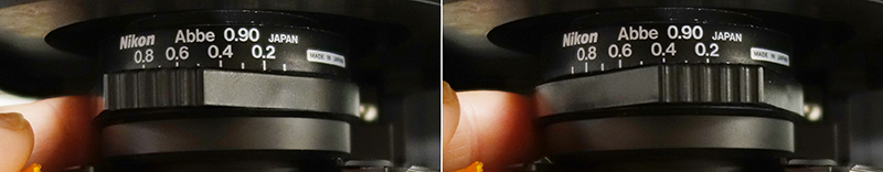 However, these is an aperture that may be adjusted to increase or decrease contrast to see tissue morphology. It should be in the position at the left for most applications. But people who want to generate more contast may turn it as pictures at the right.