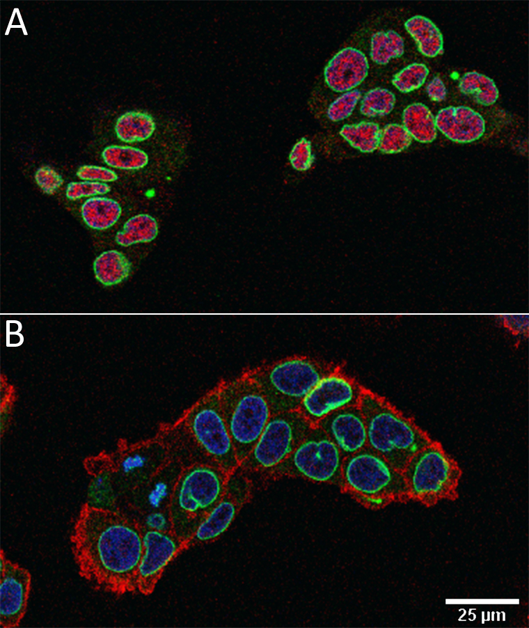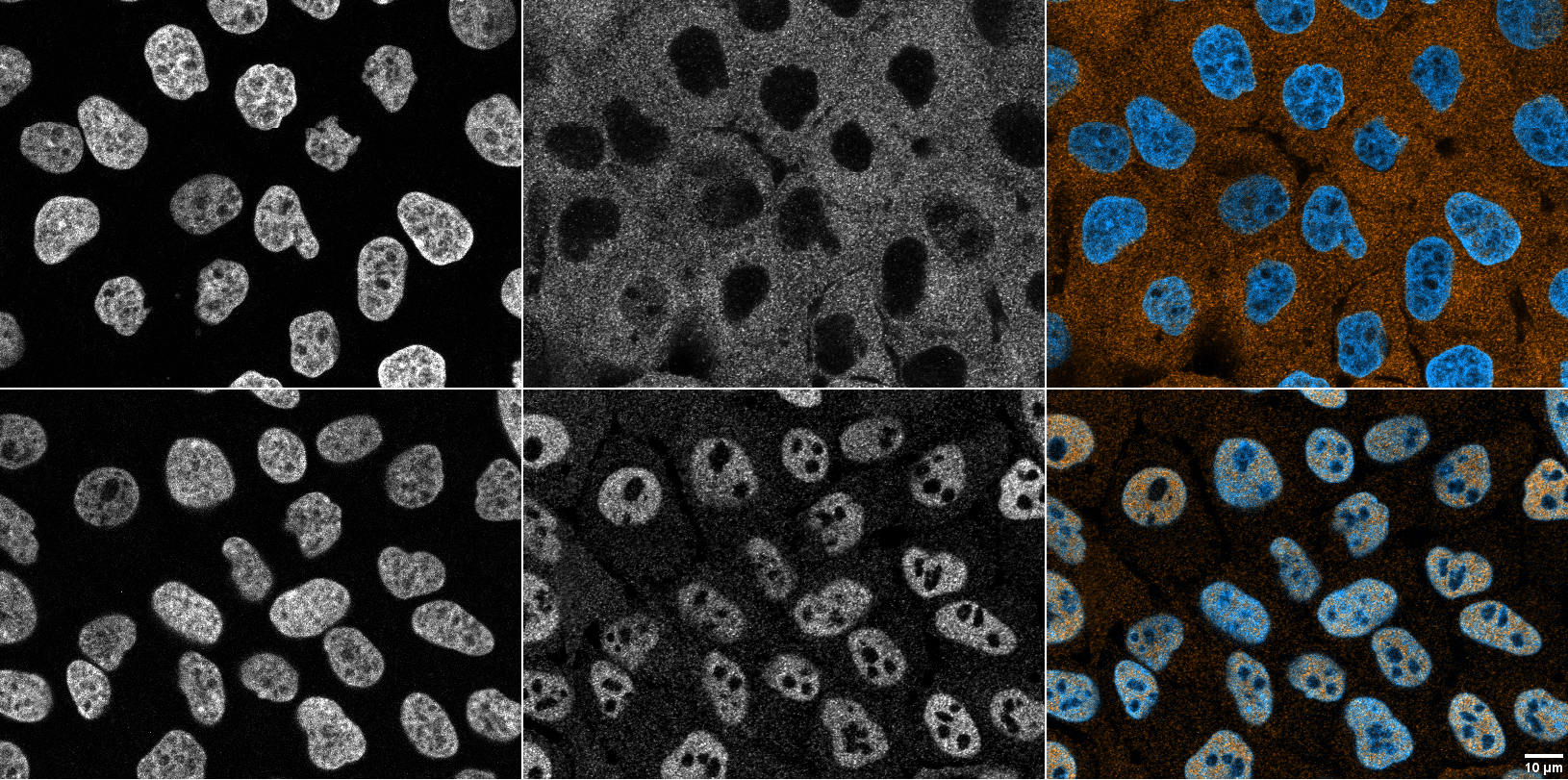 Examples of nuclear translocation assay. Any confocal microscope can be used for this.