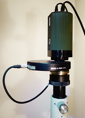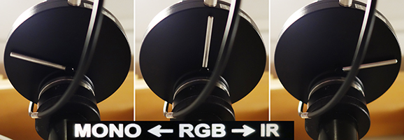 The picture below is of the camera on top of the microscope. On the underside of the black disk there is a metal lever that needs to be set to the MONO position or the RGB position before you start imaging.
