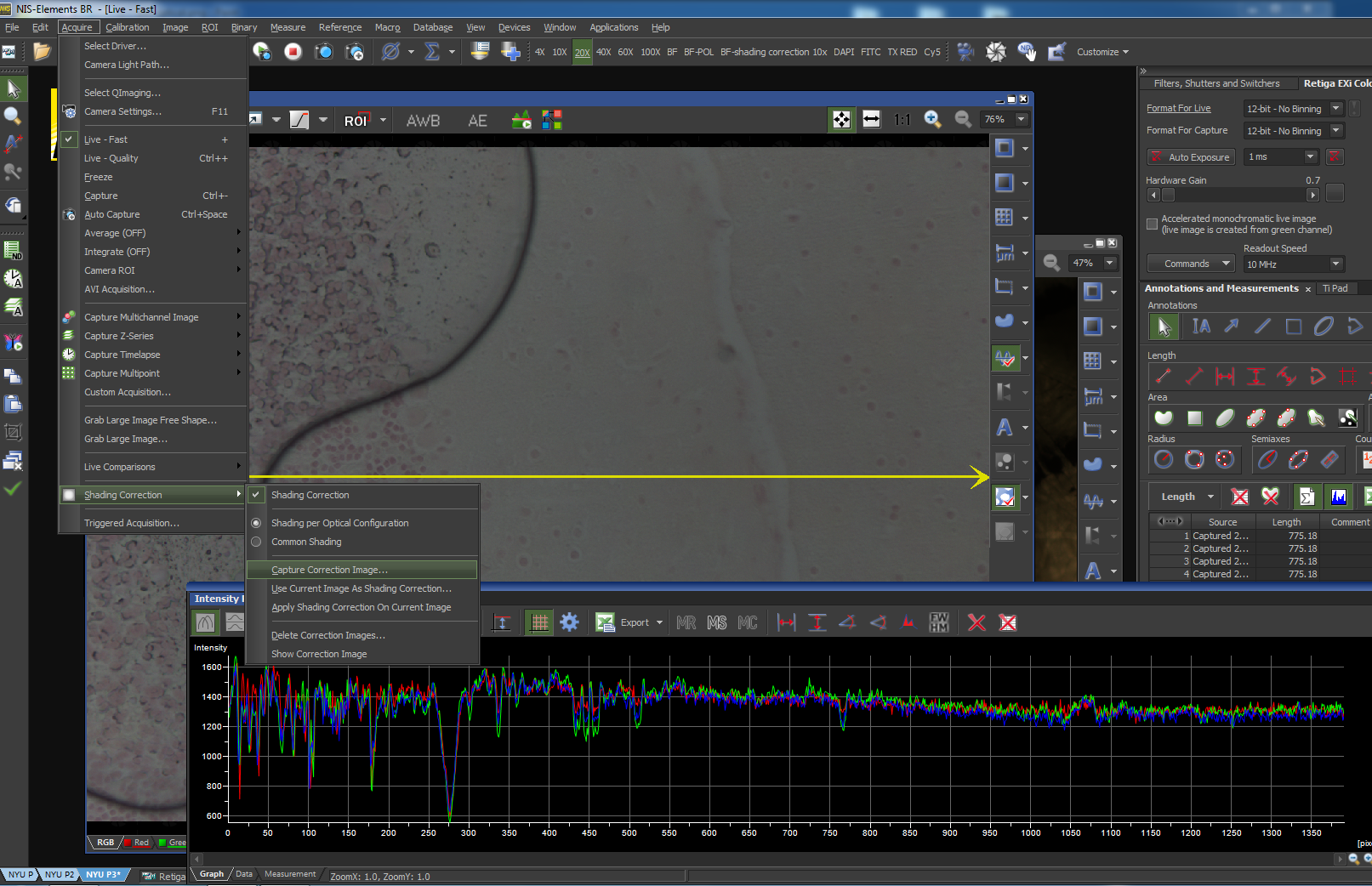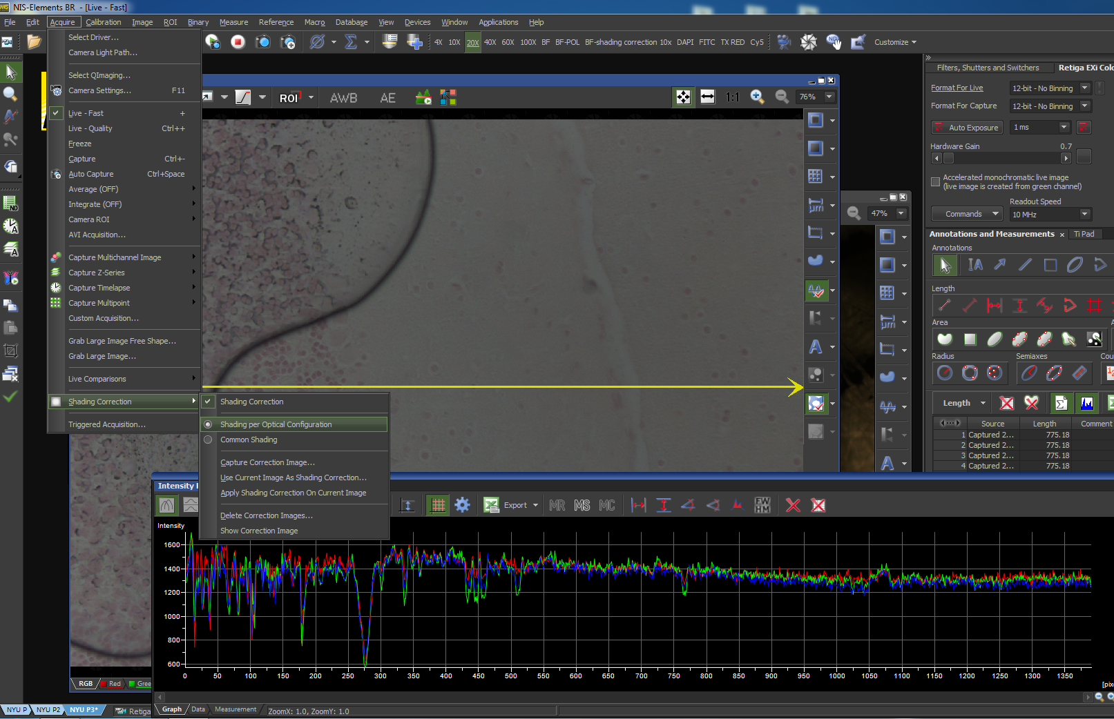 This microscope has a camera for standard histology. There is a separate setting for fluorescence. It is important to make sure you set this correctly. Scroll down for explanation.
