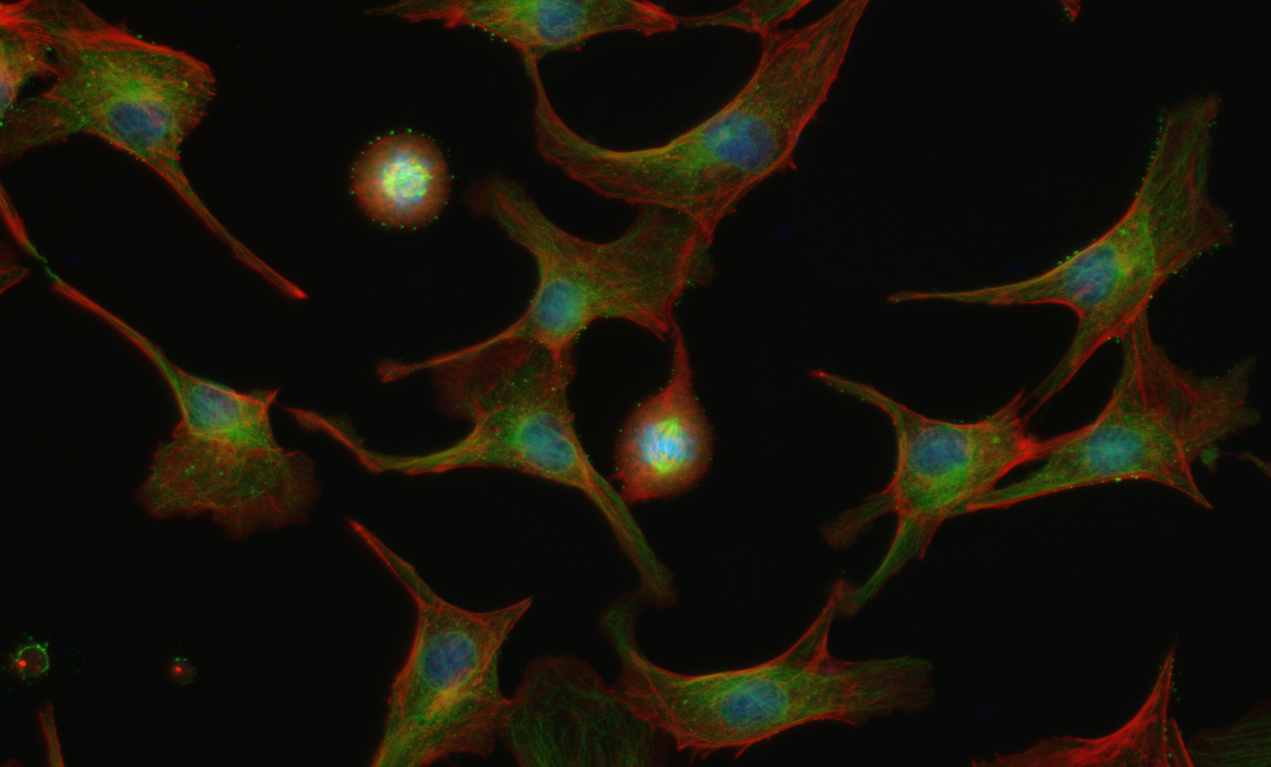 Example image of f-actin (red), tubulin (green), and DNA (blue) using the 40X N.A. 0.75 lens. Nuclei are approximately 10 um diameter.